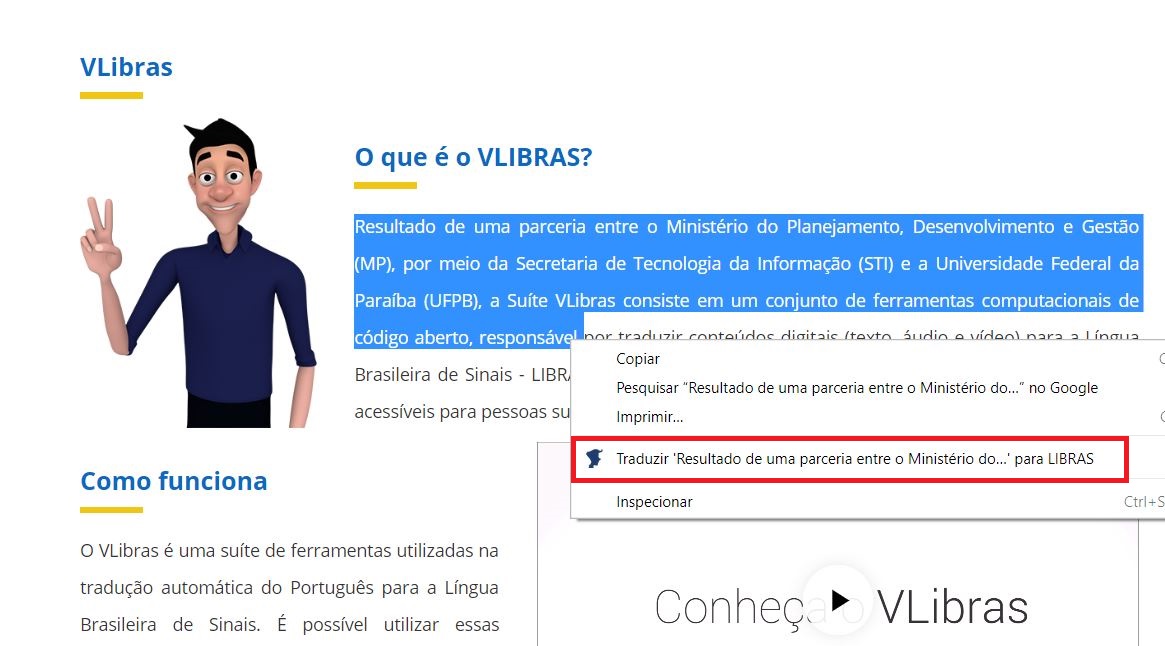 Após instalar o plugin em seu nevegador, basta selecionar o texto que deseja ser lido em libras, em seguida, clicar com o botão direito sobre o texto selecionado e escolher a opção "Traduzir "...." para LIBRAS, conforme imagem abaixo. Uma caixa com avatar irá se abrir e o texto começará a ser tratuzido.
